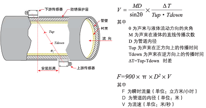 當(dāng)超聲波束在液體中傳播時,液體的流動將使傳播時間產(chǎn)生微小變化,其傳播時間的變化正比于液體的流速,零流量時,兩個傳感器發(fā)射和接收聲波所需的時間完全相同(唯一可實際測量零流量的技術(shù)),液體流動時,逆流方向的聲波傳輸時間大于順流方向的聲波傳輸時間。其關(guān)系符合下面表達(dá)式: