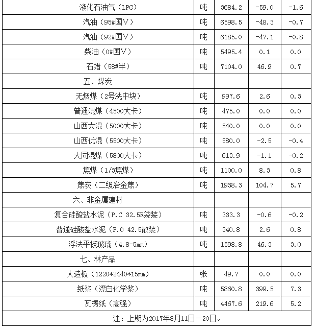 流通領(lǐng)域重要生產(chǎn)資料市場價格變動情況(2017年8月21日—30日)
